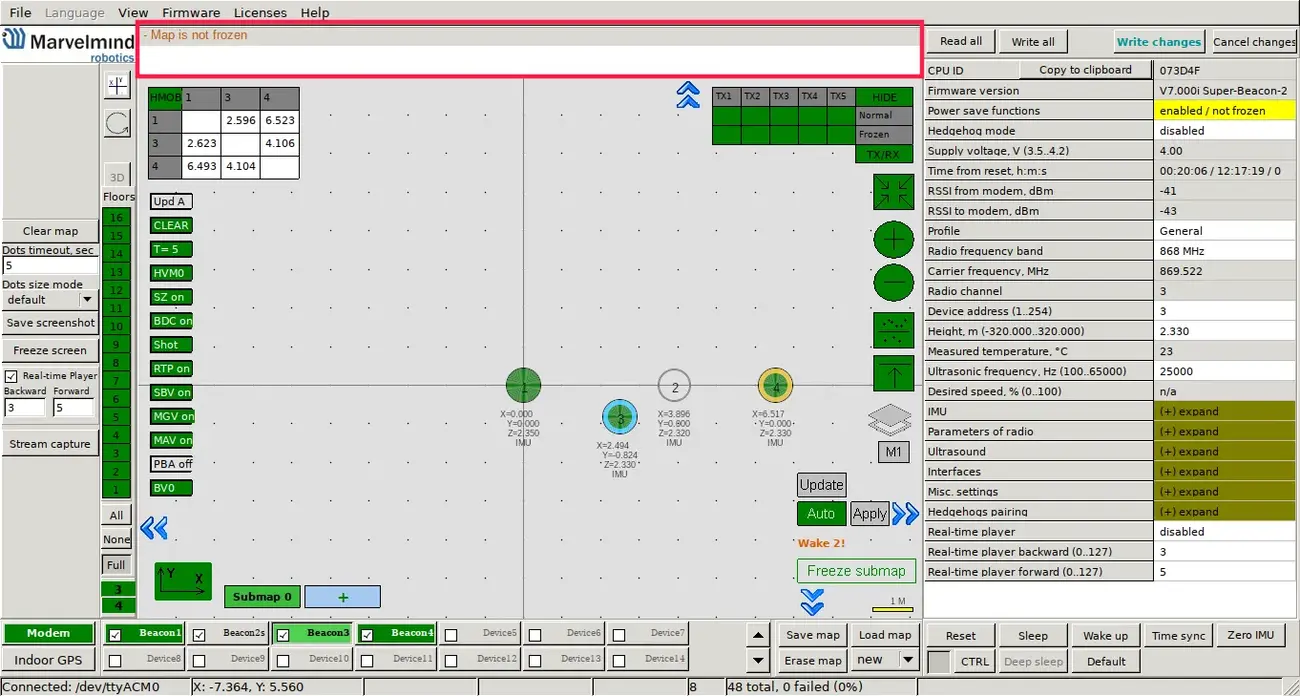 The last step is to freeze the submap and the map (provided that everything in the previous steps was good). When you freeze the map, stationary beacons will stop measuring relative distances and will be ready to measure distance from the mobile beacon.